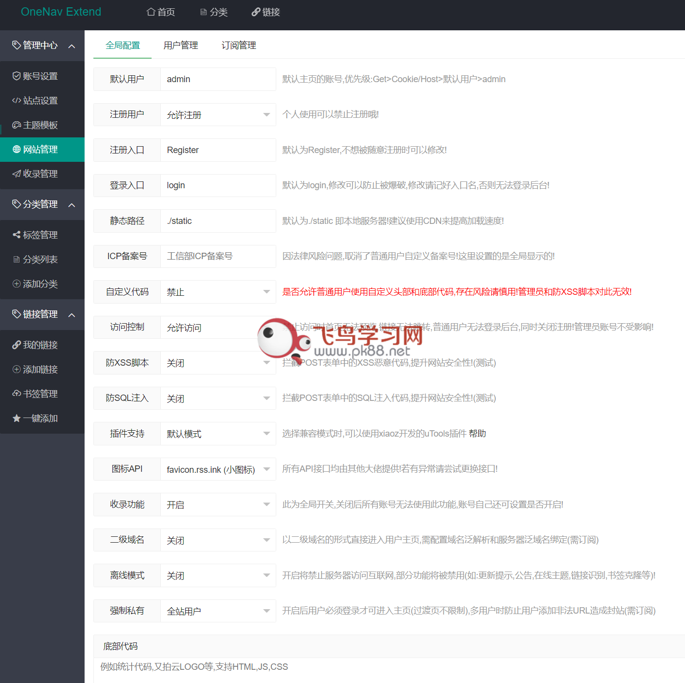 网址导航书签系统网站源码升级版可帮助你你将浏览器书签集中式管理,解决跨设备、跨平台、跨浏览器之间同步和访问困难问题,做到一处部署,随处访问。是基于xiaoz原创的OneNav基础上进行大量的修改,实现了更多的功能!现与xiaoz版是分开发布,独立维护的!文章源自飞鸟学习网-https://www.pk88.net/2022-1219-2.html