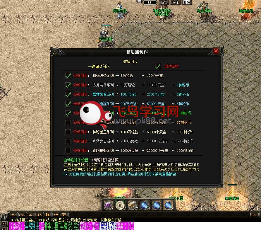 打怪自动回收装备,自动吃珠子,捡材料.把枯燥无聊的事交给挂机!
