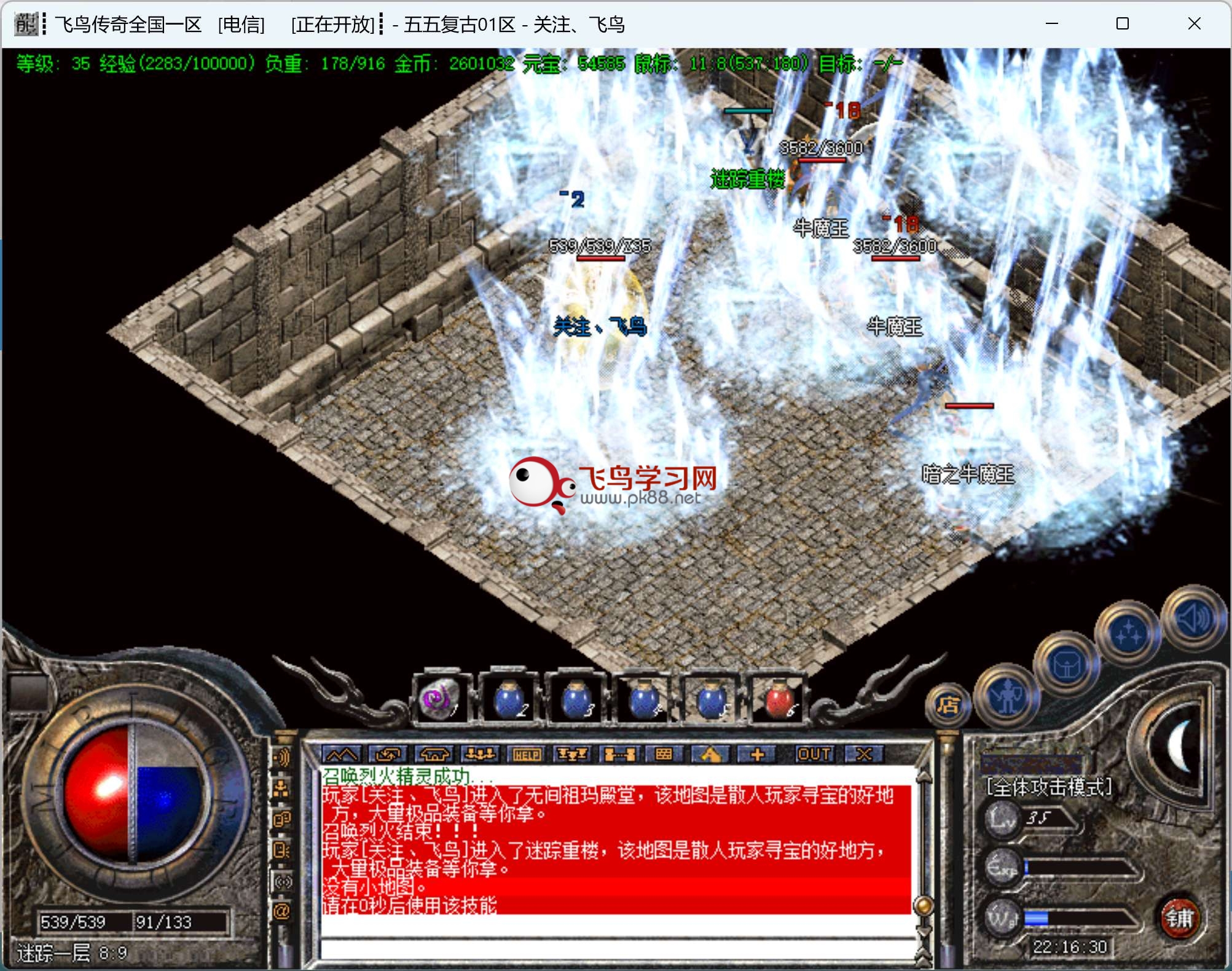 3.法师增强冰咆哮范围加大、威力加强。增强魔法盾防御,26级招巨型多角虫、46级可以招900血的半兽勇士,完全免疫物理攻击,48级可以招至尊虎卫,无限拉风;文章源自飞鸟学习网-https://www.pk88.net/2023-1209.html