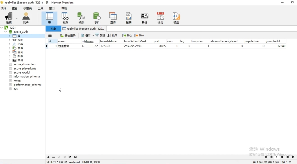 5.数据库连接上之后修改服务端的外网ip。(本地单机电脑可忽略此步。)打开acore_auth数据库下的realmlist数据表。修改address那一列的内容为你的公网ip。服务器名称在前一列修改。修改完点下方+-旁边的✔。