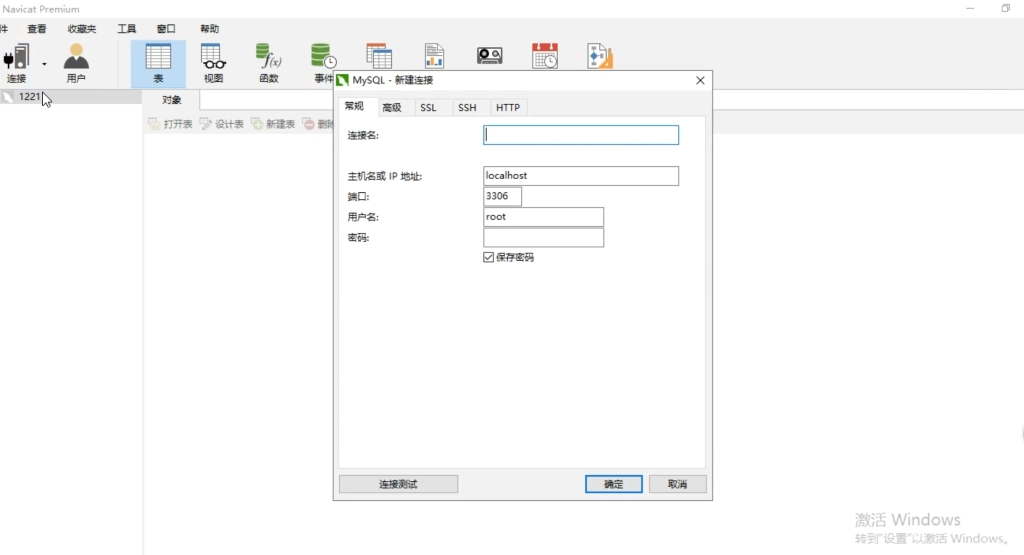 4.打开Navicat.exe,新建MYSQL连接。(本地电脑启动服务端可以忽略这一步。)连接名称可以随便填,以下都默认,密码默认是root。(密码不对的话自行查看服务端下载的地方)