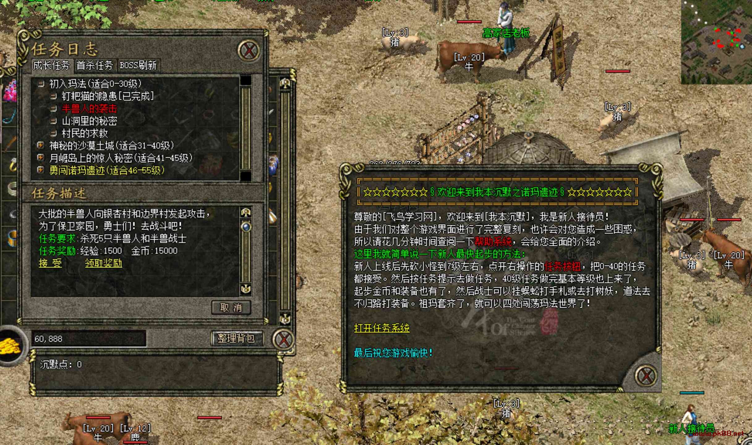 这个版本其实就是03我本沉默飞扬,玩法都一样,上线杀鸡、猪、牛? 鹿等挖肉赚第一笔金币,最快的前期升级方式是直接点开任务栏,